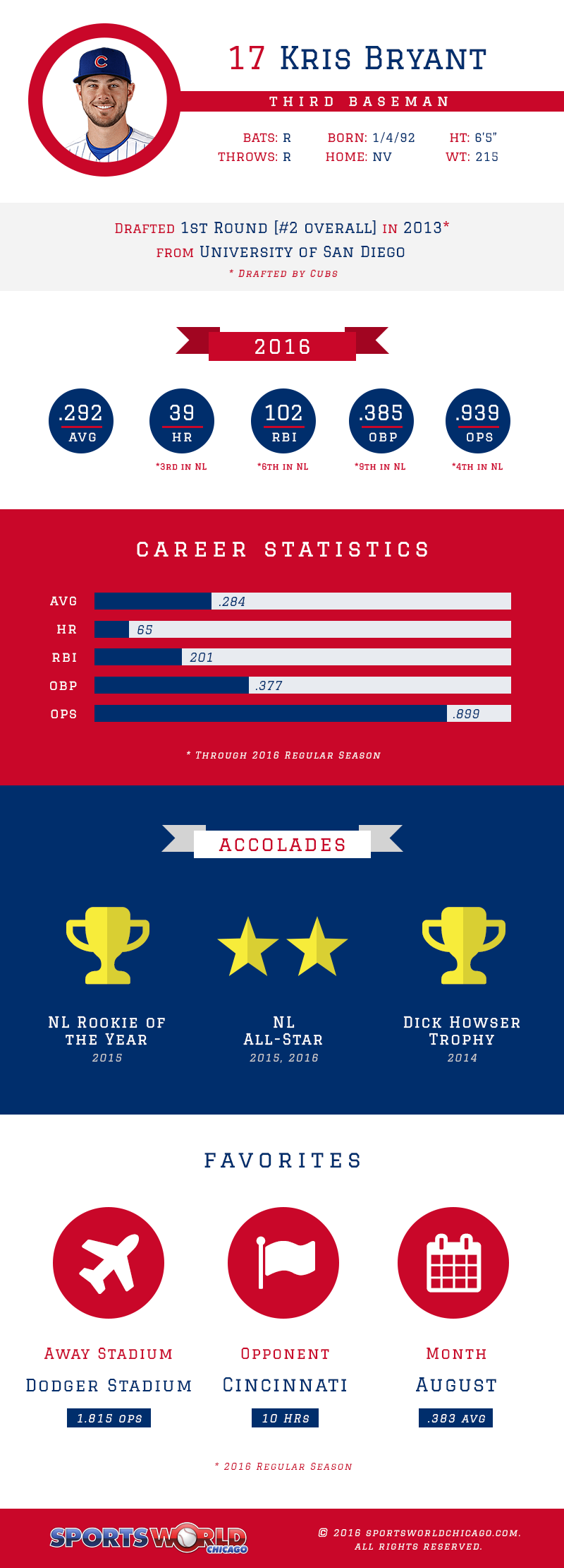In the 2016 postseason, Bryant scored 3 home runs and 8 RBI's from his 65 at bats.